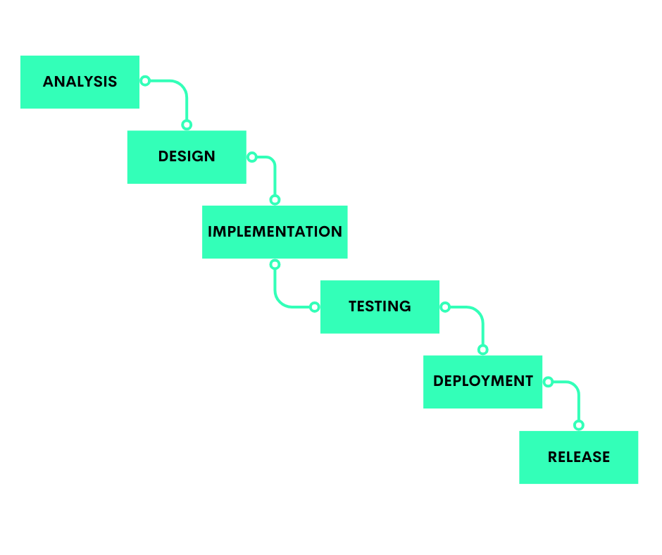 Waterfall, also known as a linear sequential model, follows a linear path, where each phase is completed before moving on to the next. The steps of software development in Waterfall projects typically include requirements gathering, design, implementation, testing, deployment, and maintenance. One software development life cycle encompasses one iteration of these phases.