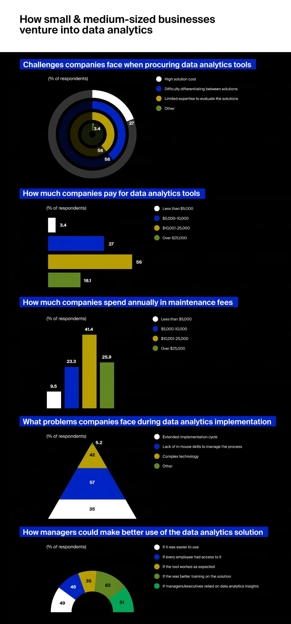 According to a survey conducted by 1PATH, 46% of small and medium-sized businesses spend anything between $10,000 and $25,000 to purchase a data analytics tool, while 41% of the respondents pay an equal amount in maintenance fees annually.